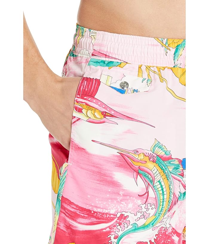 Get vacation ready in a Polo Ralph Lauren Explorer Swim Trunks. The swim short is crafted from a lightweight poly woven with a cool print throughout. Elasticized drawstring waist. Pockets: Hand pockets at the sides. Button